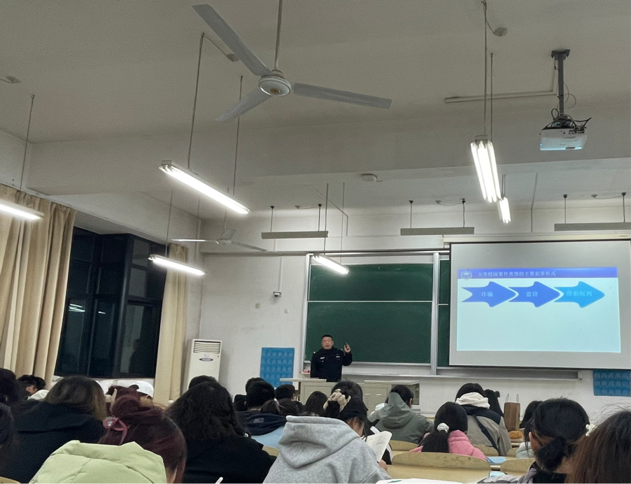 讲座中,张警官首先通过列举同学身边最近的真实案例与反诈宣传视频相结合向我们展示了诈骗手段的多样性,例如电商诈骗、物流诈骗、裸聊、冒充公检法等等,来提醒警示同学们在日常生活中要注意防范三思而行,最重要的是要第一时间向警方求助。其次,张警官结合法律条文指出校园中会经常遇到安全隐患和人身权益遭遇侵犯,如宿舍盗窃、恋爱纠纷、经济纠纷,并告知同学们遇事寻找辅导员和保卫处的帮助。最后在张警官简明扼要地总结中结束了本次讲座。