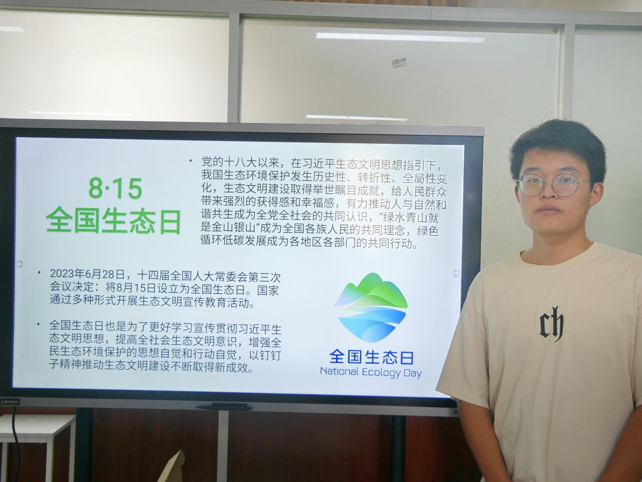 团委老师易毅老师发表了讲话。党的十八大以来,在习近平生态文明思想指引下,我国生态环境保护发生历史性、转折性、全局性变化,生态文明建设取得举世瞩目的成就,给人民群众带来强烈的获得感和幸福感,有力推动人与自然和谐共生成为全党全社会的共同认识,“绿水青山就是金山银山”成为全国各族人民的共同理念,绿色循环低碳发展成为各地区各部门的共同行动。2023年6月28日,十四届全国人大常委会第三次会议决定将8月15日设立为全国生态日。国家通过多种形式开展生态文明宣传教育活动。